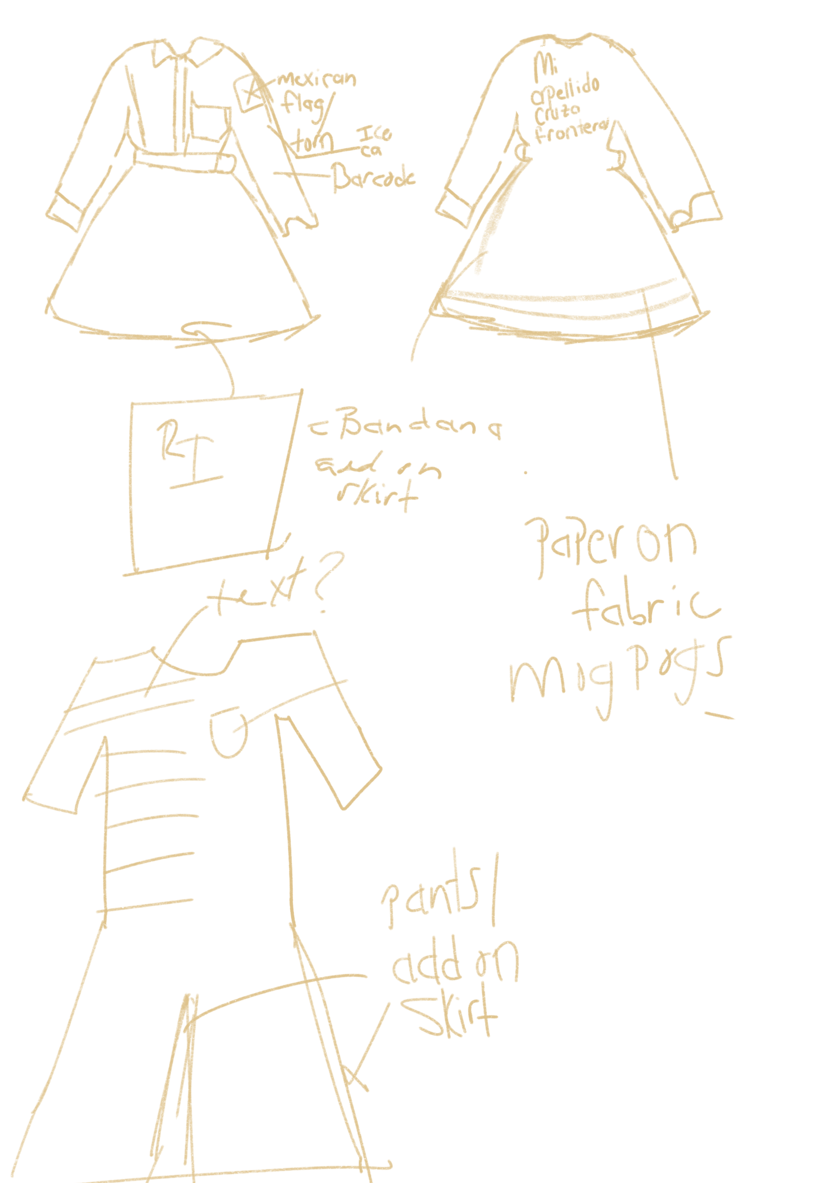 In my protest piece, I transformed a mechanic’s uniform into a traje inspired by Mexican folklórico dresses. This transformation symbolizes both the labor of survival and the cultural pride that endures despite systemic oppression. The dress’s skirt displays a visual timeline, featuring headlines and articles from the 1930s to the present day, as well as images taken during those times, highlighting deportation efforts. It highlights key moments such as the Mexican Repatriation, Operation Wetback, and modern-day deportation efforts under the Trump administration. Woven among these are phrases like “victims of political violence,” “they don’t want to remember, too late for them to do anything,” and "violence is the rhythm," calling out the government's historic and ongoing negligence.